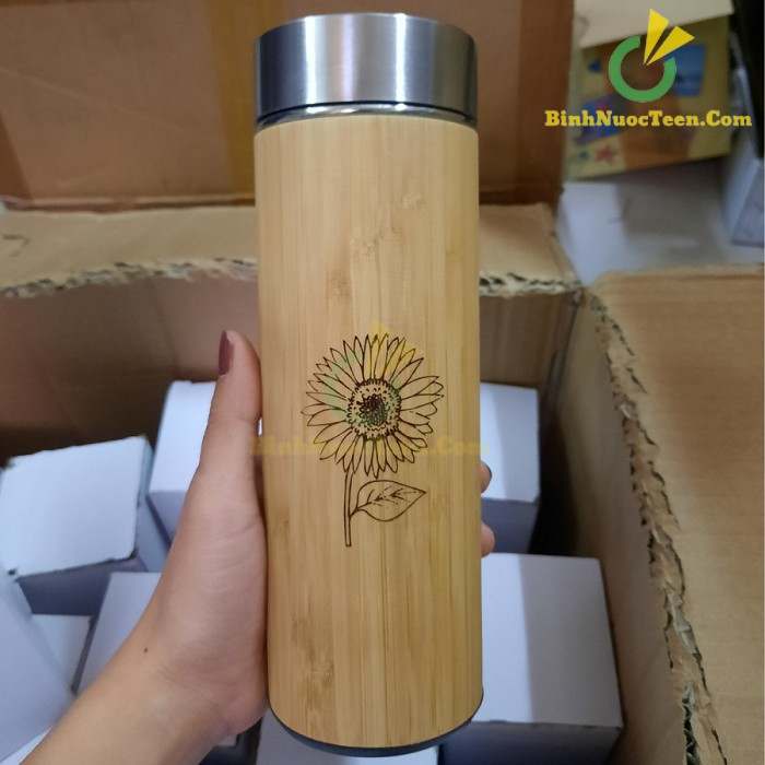 3. Bình giữ nhiệt vỏ tre khắc ảnh, slogan truyền động lực